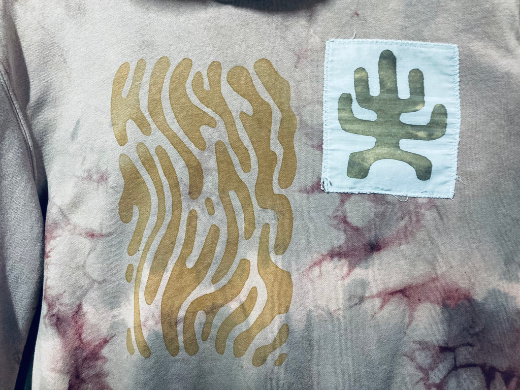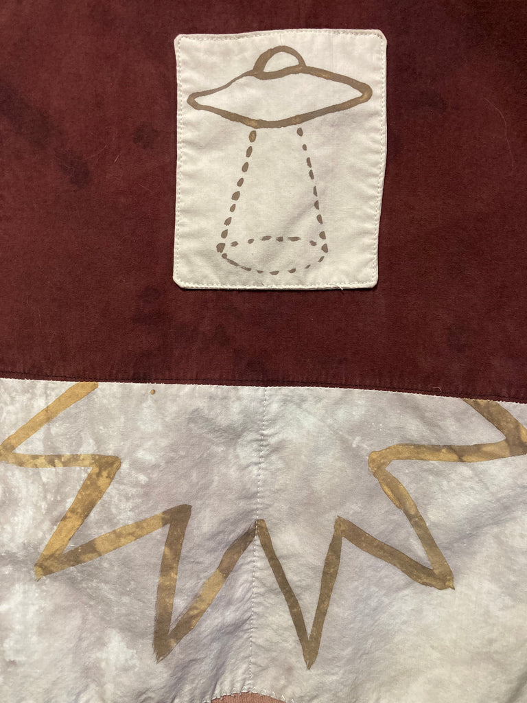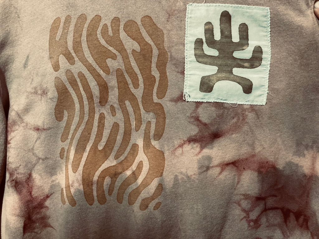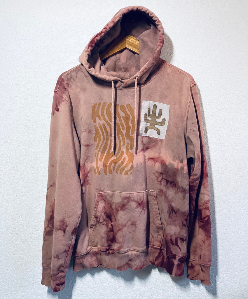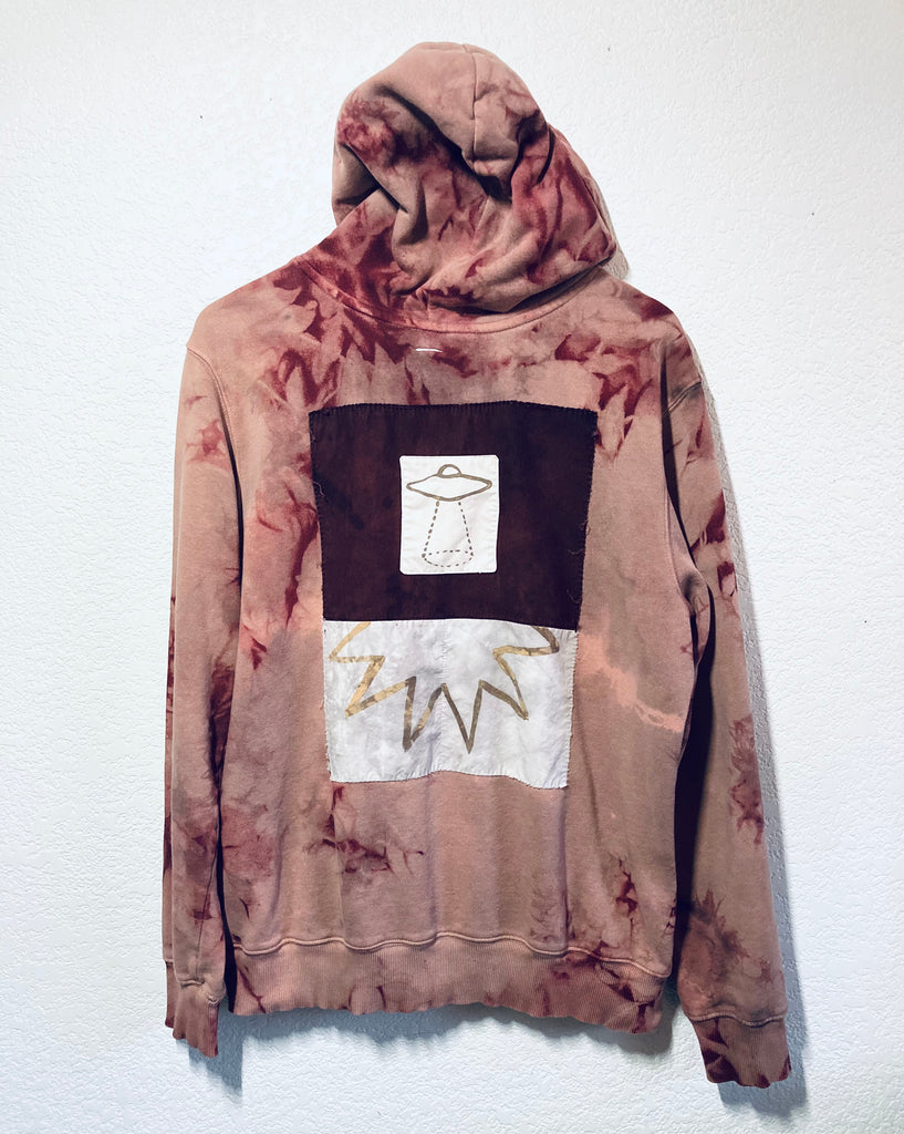 This coral hoodie has been bundled and dyed in iron and tannin baths, screen printed with iron ink, and has patches on the front of a cactus spirit, and a UFO collage patchwork on the back. medium weight 100% cotton.