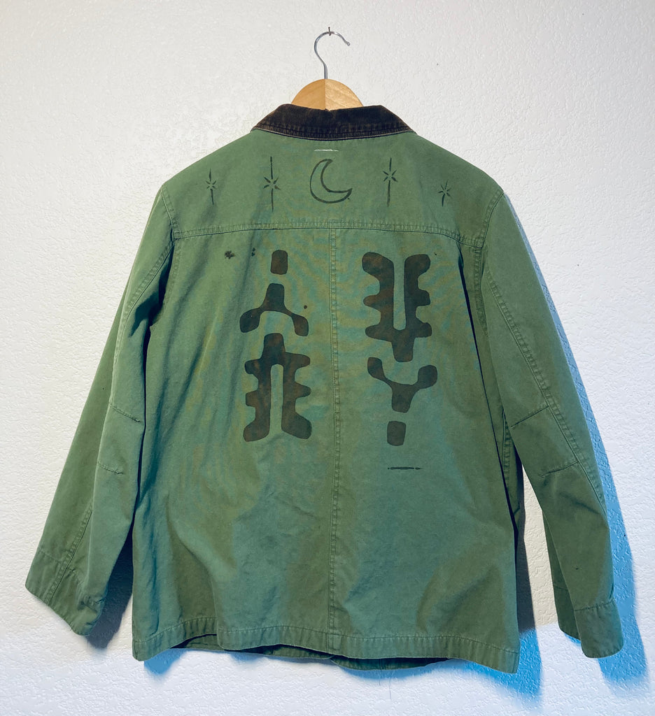 Great condition 90's east coast field coat hand painted with iron ink and cured in a tannin bath. Screen printed designs and moon & stars painted on back panels.