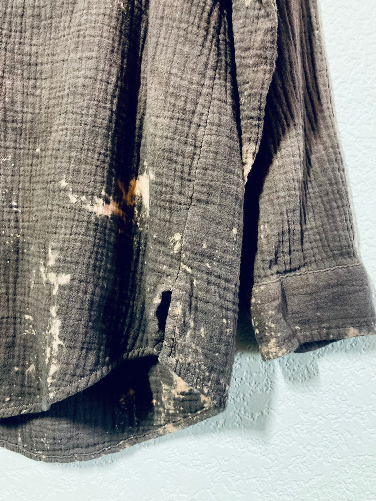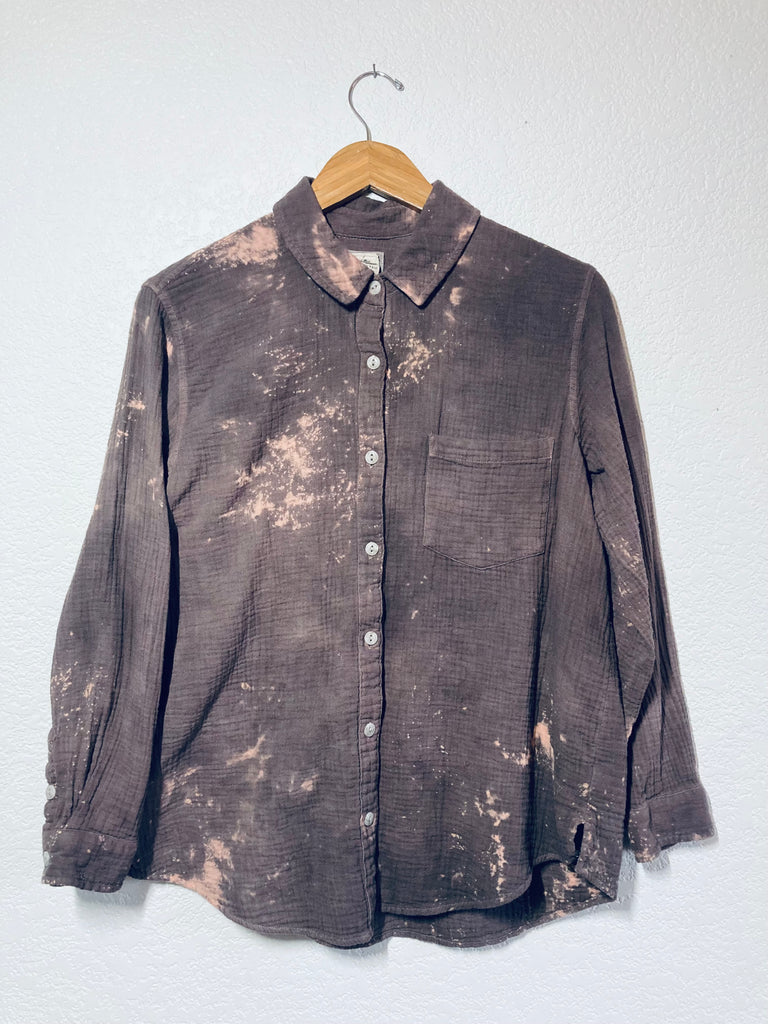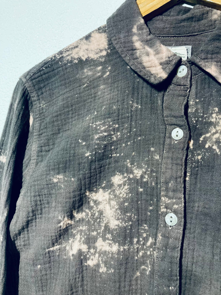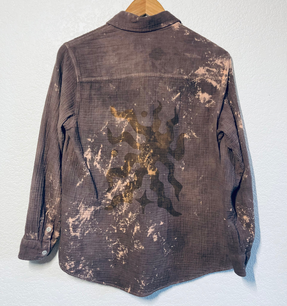 Waffle knit textured cotton button up long sleeve shirt. Hand dyed with iron, plant tannins, and soda ash for a natural "bleach" effect. Screen printed STAR-BEING design on back. The finished color is hard to photograph, it's a purpleish grey with pink splashes.